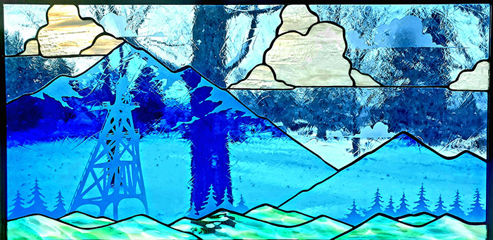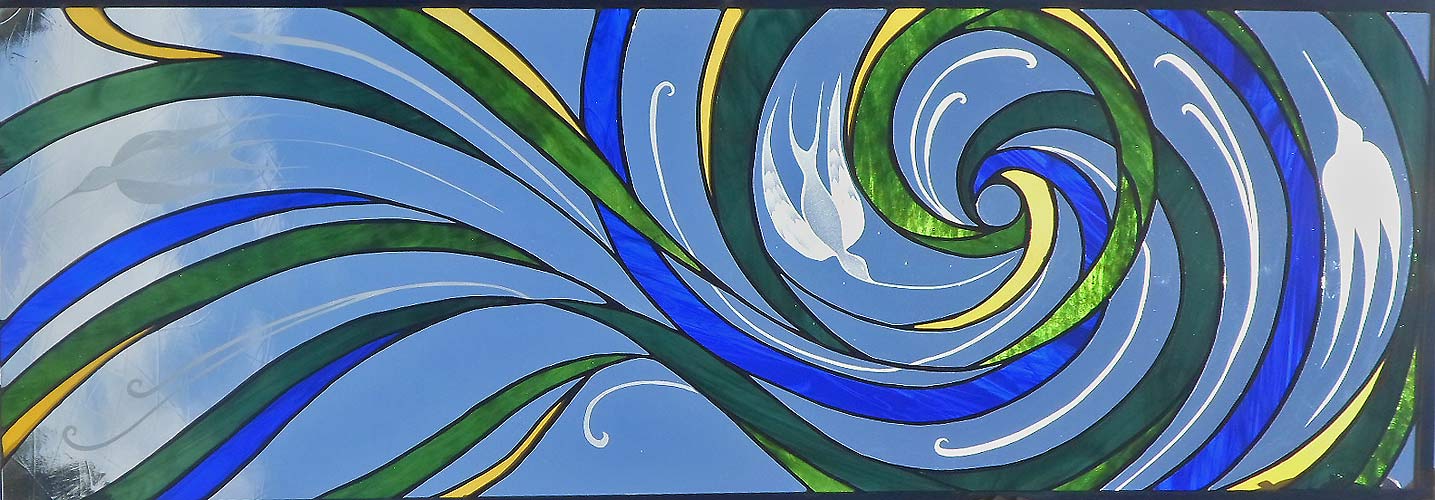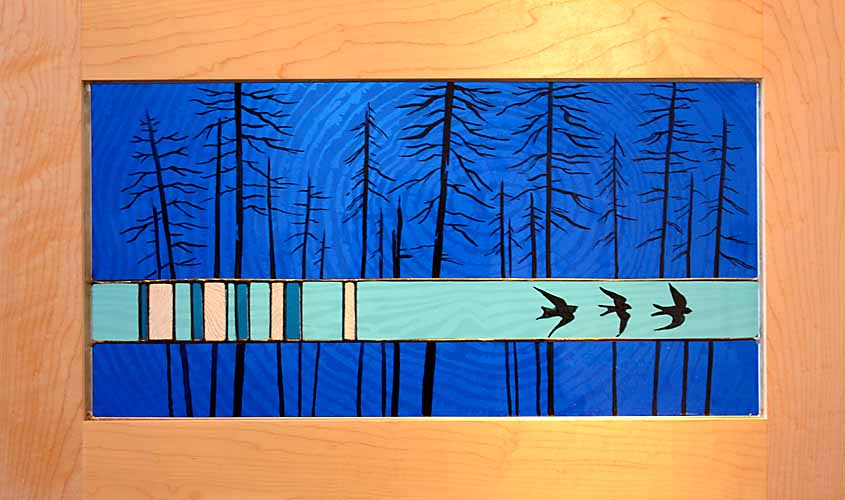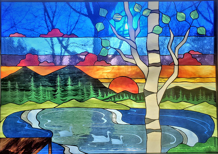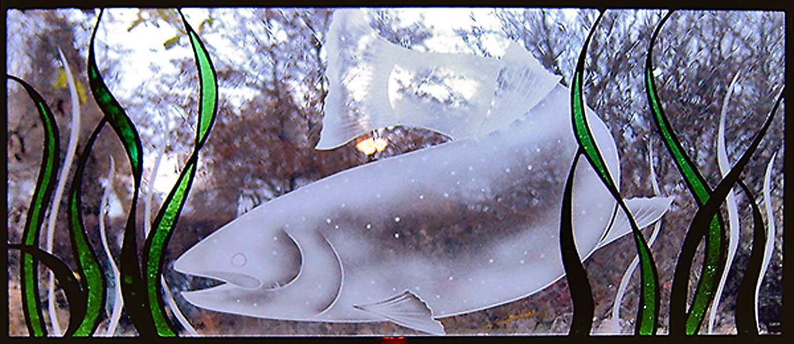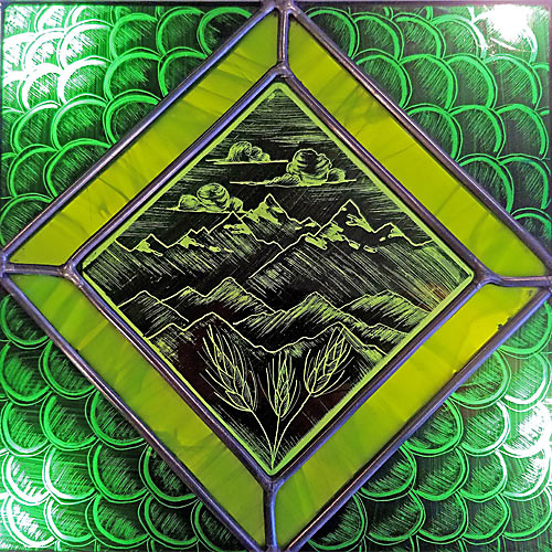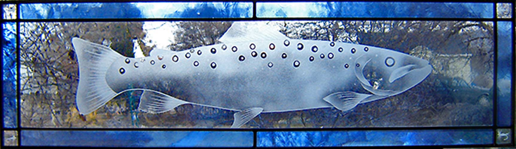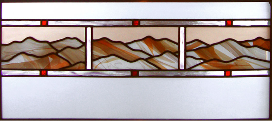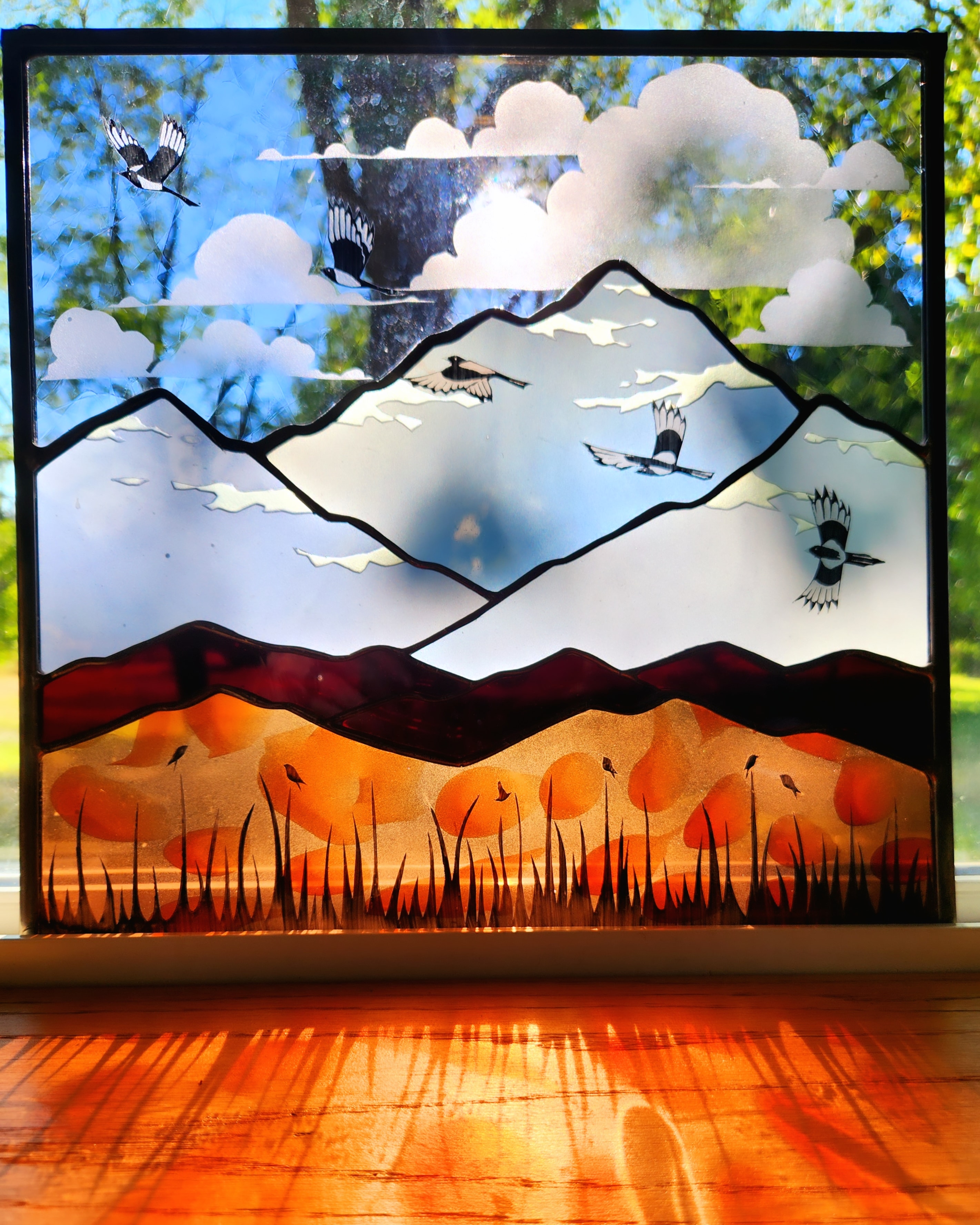 These pieces of stained glass art are free hanging windows that can be hung in any window space. They are like a painting of glass for your window. I love combining etched, painted and leaded glass into layered pieces of glass art. These works can be abstract or include detailed sandblasted landscapes and animals. Trout and mountains are a popular theme here in Montana.