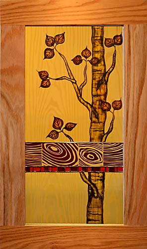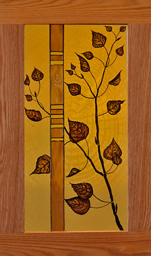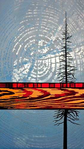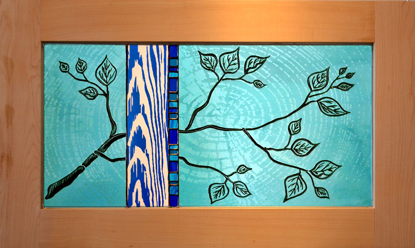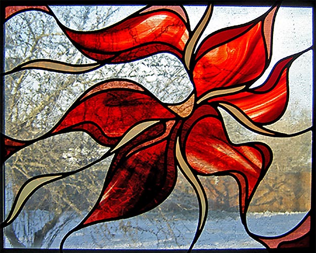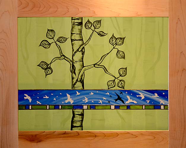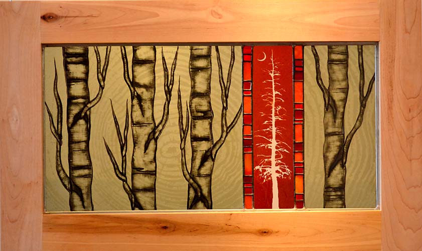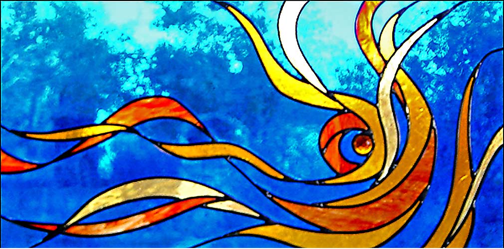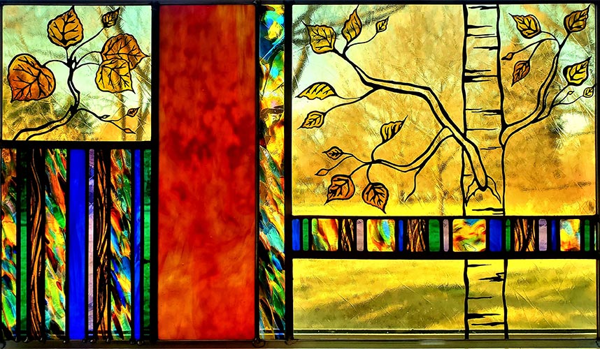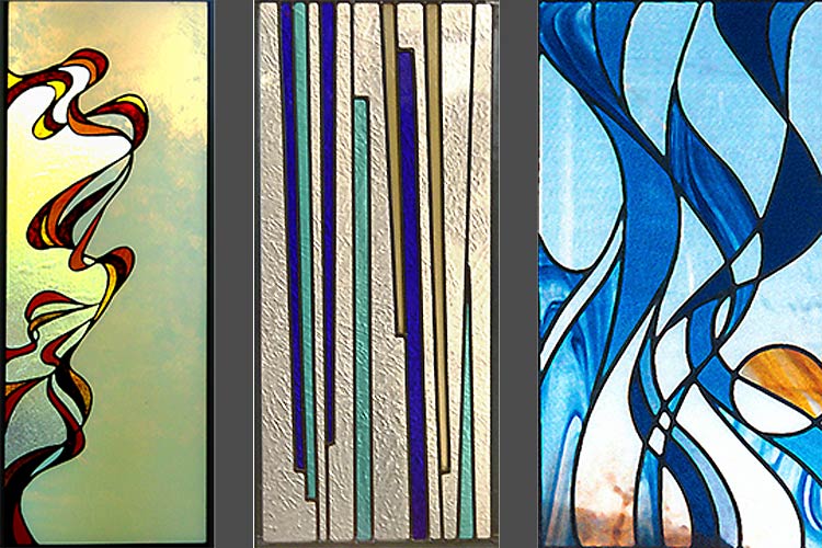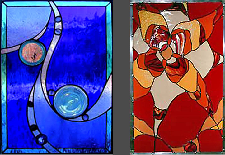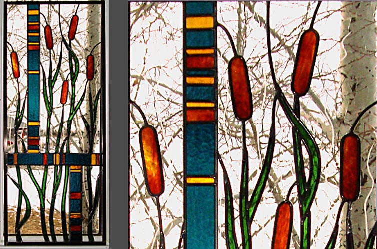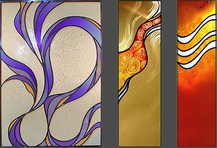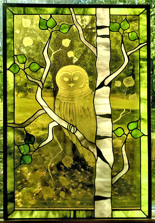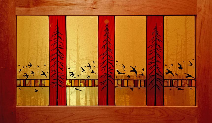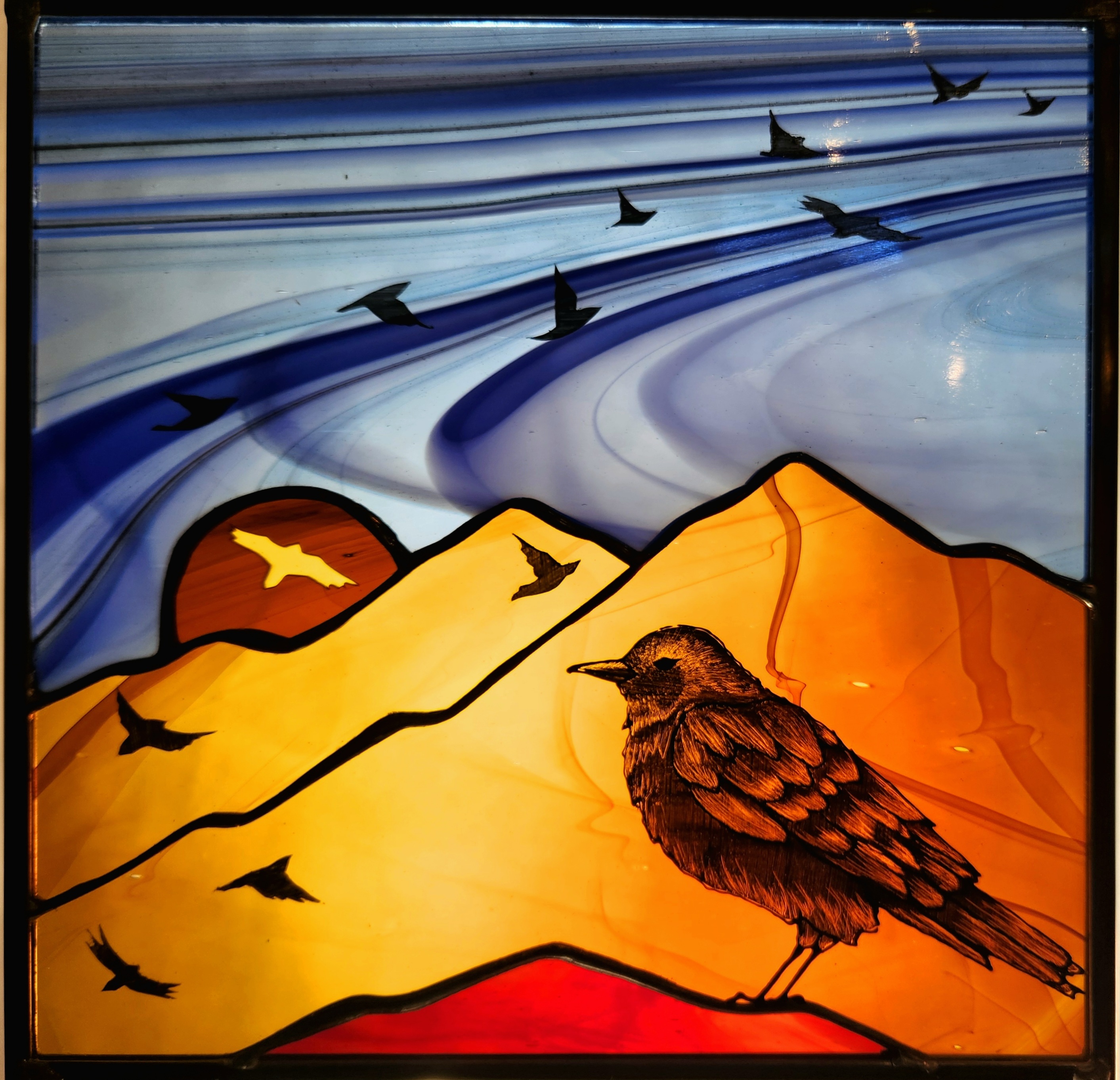 These pieces of stained glass art are free hanging windows that can be hung in any window space. They are like a painting of glass for your window. I love combining etched, painted and leaded glass into layered pieces of glass art. These works can be abstract or include detailed sandblasted landscapes and animals. Trout and mountains are a popular theme here in Montana.